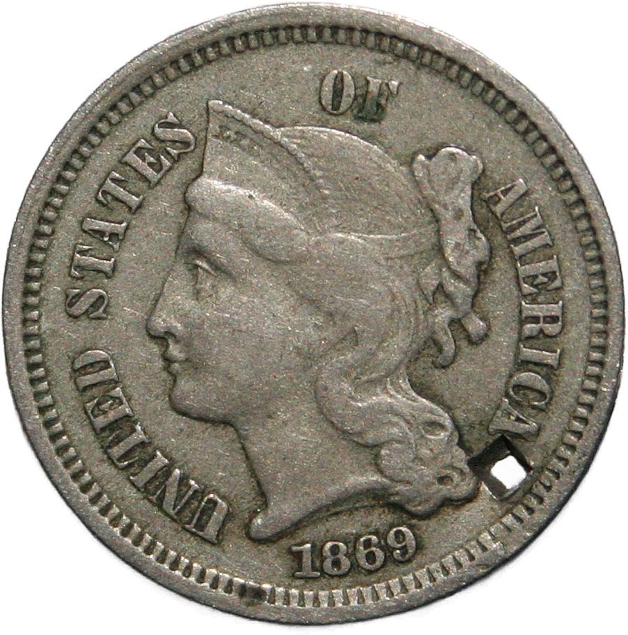 | United States 3 cents - 1869 KM# 95 ( 1865–1889 ) cupronickel very fine (holed) July 2020 → October 2022 |