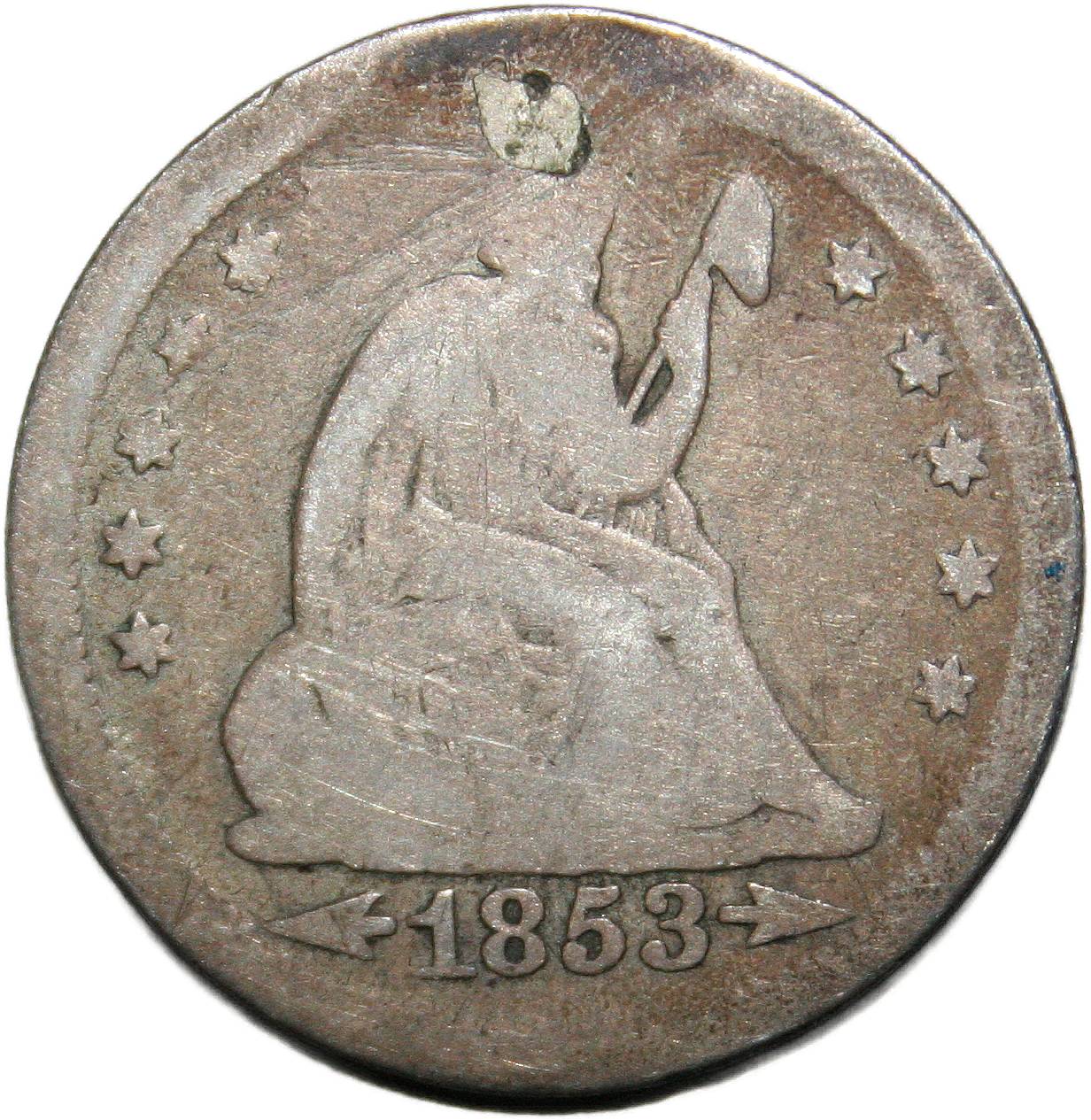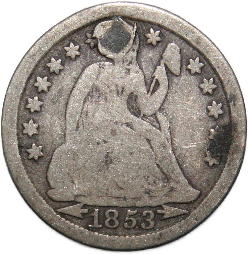 | United States 1 dime - 1853 KM# 77 ( 1853–1855 ) 90% silver - 0.0680ozt Ag very good (filled hole) February 2022 |