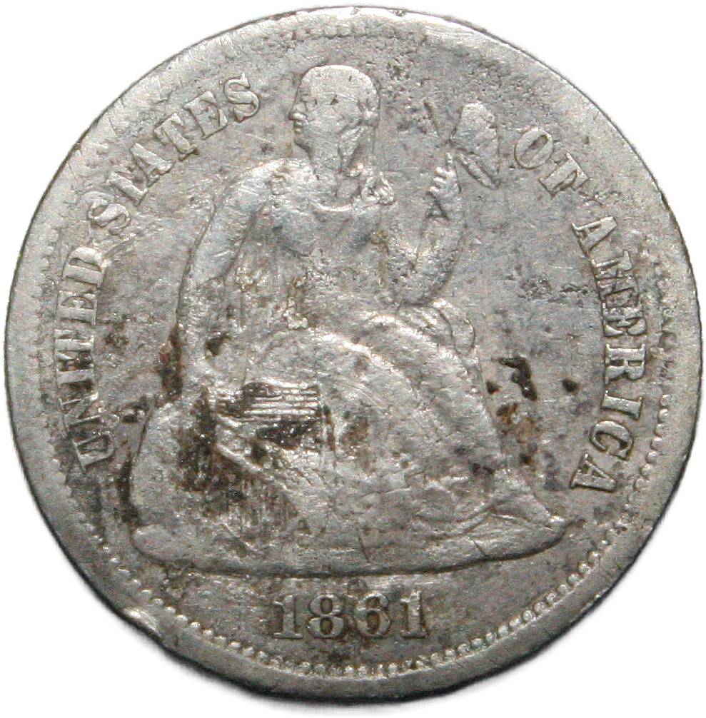 | United States 1 dime - 1861 KM# 92 ( 1860–1873 ) 90% silver - 0.0676ozt Ag very fine (damage) February 2025 |