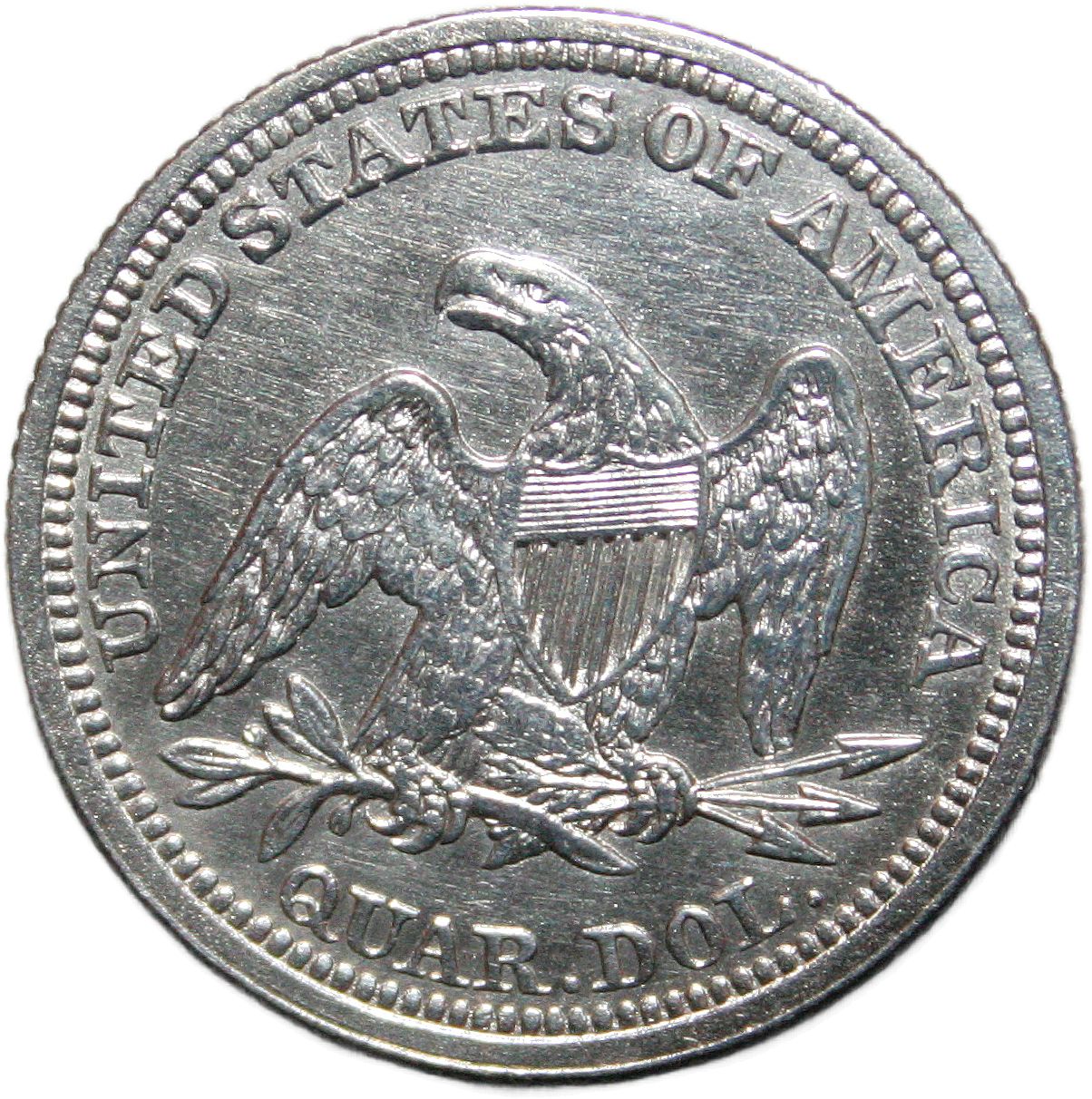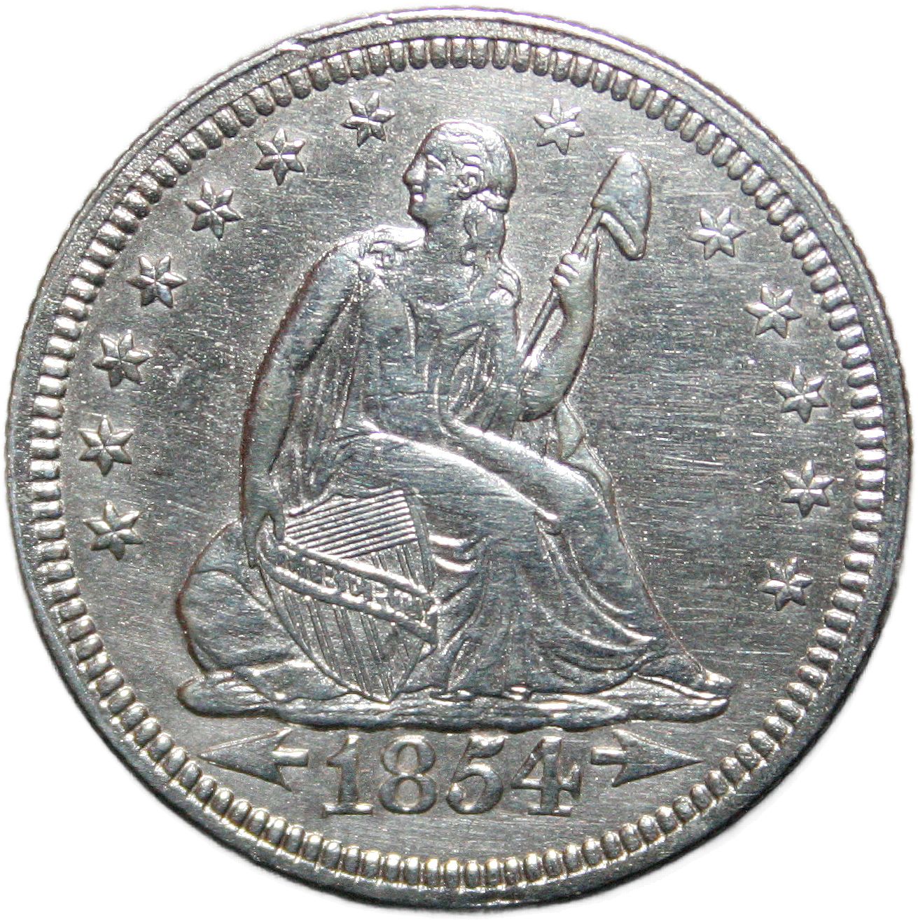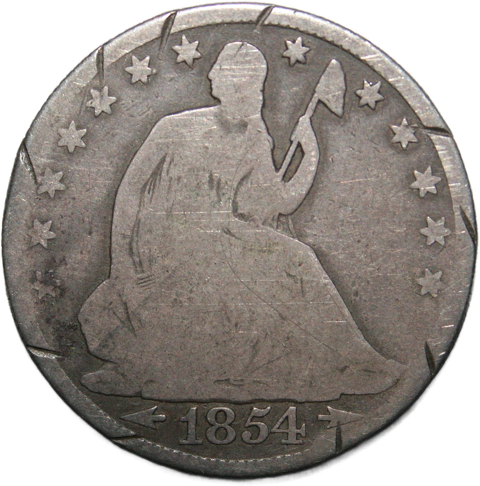 | United States ¼ dollar - 1854 KM# 81 ( 1854–1855 ) 90% silver - 0.1801ozt Ag extremely fine (cleaned) October 2022 → November 2025 |