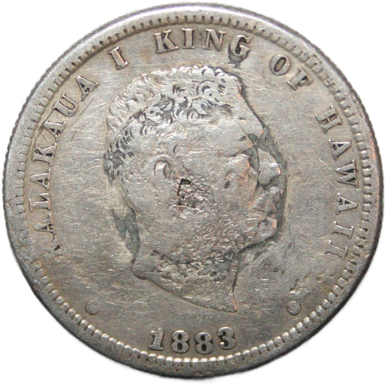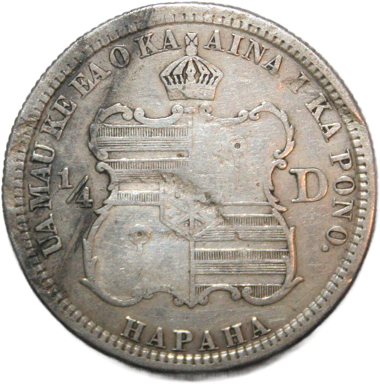 | Hawaii† ¼ dala - 1883 KM# 5 ( 1883 ) 90% silver - 0.1783ozt Ag Kalākaua very good (damage) April 2025 |